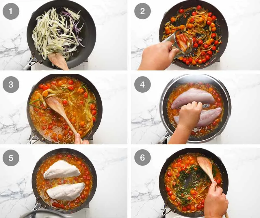♦ Tiếp đó, đặt cá lên trên nước sốt, đậy nắp, om trong lửa nhỏ, rắc húng quế, mùi tây là hoàn thành.
