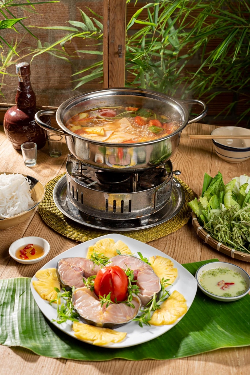 Nước lẩu chua thanh vị chanh dây, thơm dịu, hòa cùng vị ngọt tự nhiên của cá tầm săn chắc, béo nhẹ. Ăn nóng
