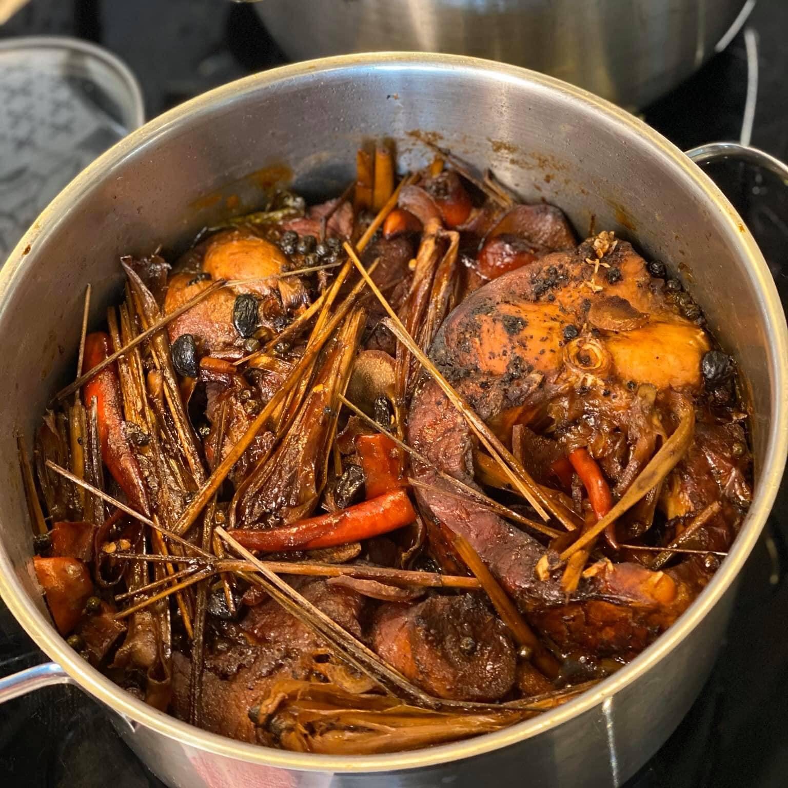 ♦ Trong 4 tiếng này, bạn phải căn cho nước không bị cạn quá (cạn thì thêm nước kho vào). Nếu màu chưa đẹp thì bạn pha thêm nước hàng với nước sôi.