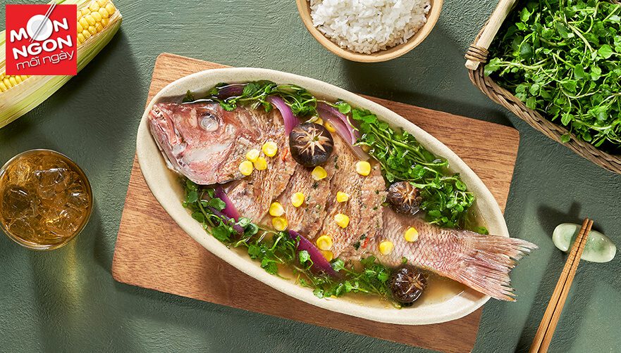 Chuẩn bị 1 đĩa oval lòng sâu, cho xà lách xoong xung quanh, đặt cá lên trên, múc nấm đông cô, ngô, hành lá, ớt sừng lên trên cùng, rưới canh và thưởng thức.