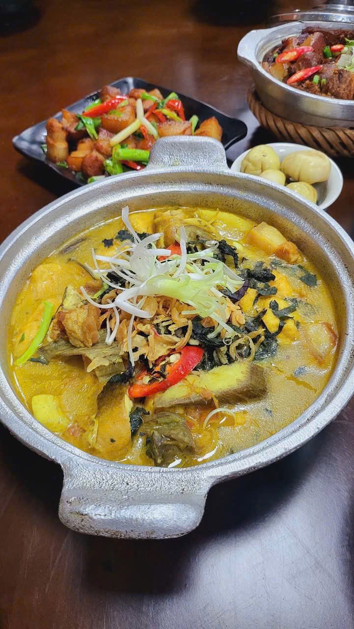 Thịt cá lăng săn chắc, béo nhẹ hòa quyện với vị bùi của chuối xanh và mềm ngậy của đậu phụ. Nước om vàng sóng sánh, thơm mùi nghệ, tía tô và lá lốt tạo nên mùi vị đặc trưng của món quê dân dã
