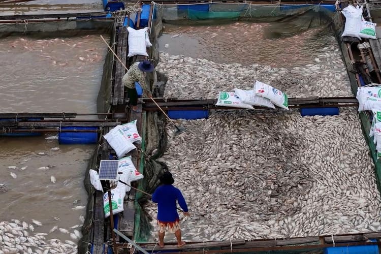 Bão số 13 không chỉ gây mưa lớn, ngập lụt nhiều nơi mà còn khiến hàng chục tấn cá lồng trên sông Krông Na, xã Ea Na, tỉnh Đắk Lắk chết hàng loạt.