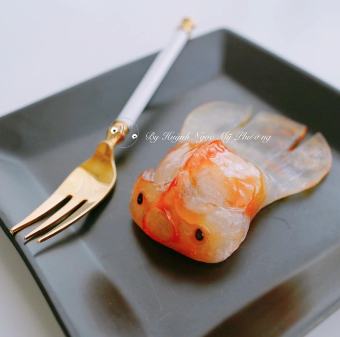 – Tạo hình con cá: 1 phần màu trắng sẽ có 5 phần bột màu cam. Sau khi đính bột màu cam lên, đem cán dẹt. Cho phần nhân tôm vào giữa và gấp bột tạo hình.