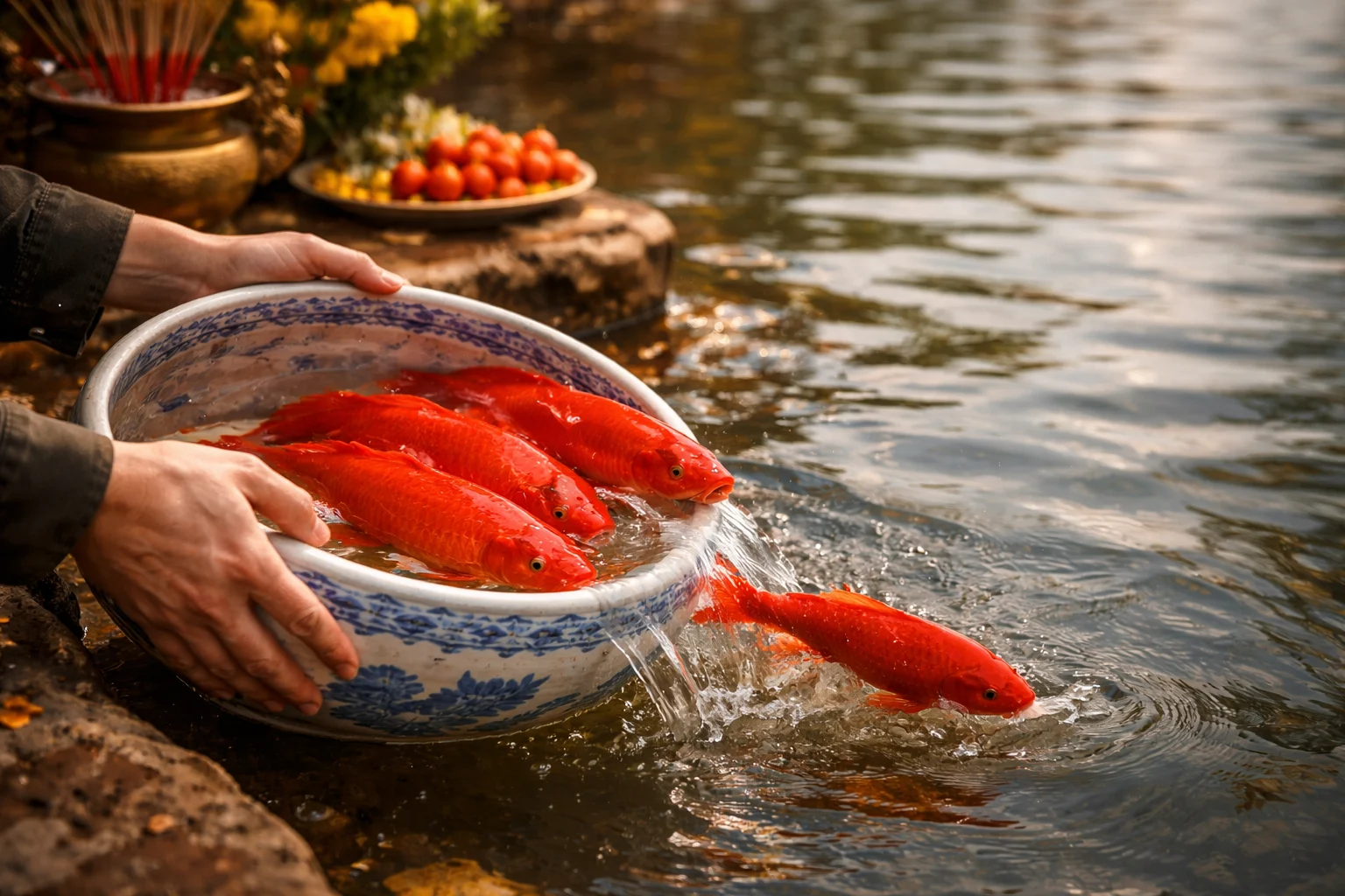 Sau khi cúng xong, cá chép sẽ được thả xuống sông, hồ, ao… Thời điểm thả cá cũng rất quan trọng: